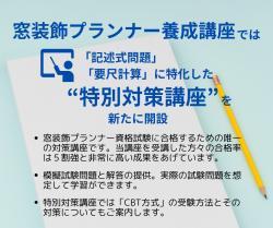 「第12回 窓装飾プランナー養成講座」は、同資格試験に連動した受験対策講座で、受講者の合格率が約5割という高い成果をあげている。今回は、選択式問題から記述式、要尺計算まですべてを網羅した「オンライン養成講座」に加えて、記述式問題と要尺計算に特化して集中講義を行う「特別対策講座」(リアルのみ)の2講座を行う。