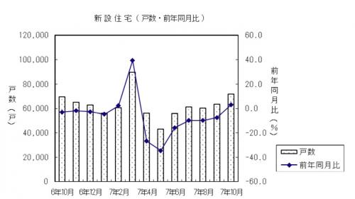 種別では持家が1万8081戸(同8.2%減)と7カ月連続の減少、貸家が3万771戸(同4.2%増)と7カ月ぶりの増加、分譲住宅は2万2480戸(同14.8%増)と7カ月ぶりの増加となった。また分譲住宅のうちマンションが1万1650戸(同31.8%増)と7カ月ぶりの増加、一戸建住宅は1万564戸(同0.5%増)と7カ月ぶりの増加となった。