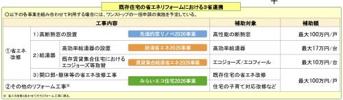 リフォーム関連では、「先進的窓リノベ2026事業」「給湯省エネ2026事業」「賃貸集合給湯省エネ2026」、および「みらいエコ住宅2026事業」(新築・リフォーム)の4事業が予定されている。