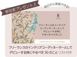 受講料は3300円(税込)。定員は来校16名(オンラインは定員なし)。申込締切は6月21日(日)。参加特典として「フリーランスのインテリアコーディネーターとしてデビューする時にやるべき30のこと」リストが提供される。