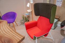 このほか、三菱地所では東京駅周辺のオフィスで使われていた良質な家具をリユースする「エコファニ」を展開しているが、今回は倉庫から「とまり木」に合いそうなものを複数チョイス、アイコン的なチェアには張り地を人気のブークレのブラウンと、赤のコンビ生地に替えてリメイクし、設置。さらに、樹齢百年の無垢のクスノキを使ったテーブルは、有機的なフォルムと手触りを残した仕上げとした。