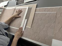 「当初はデジタルプリントによって織物壁紙をデザイン化したいと考えていましたが、今ではデジタルプリントを通じて織物壁紙の素材感や魅力を感じていただきたいと思っています」と語る小嶋氏であった。