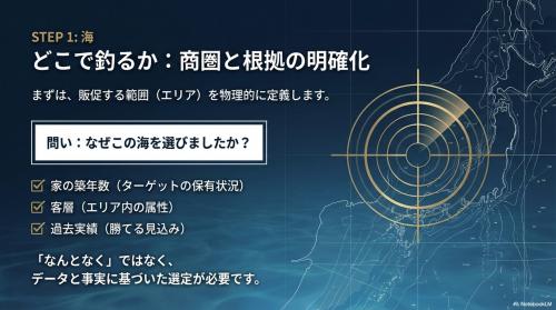 前回、販促は「打ち手」ではなく「設計」であると定義した。その設計の最初の工程が「海」、すなわち商圏設定である。ここが曖昧なままでは、どのような販促活動を行っても安定した成果は得られない。