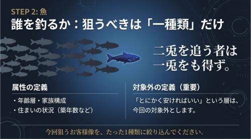 では、その海において、次に考えるべきこととは何か。それが「魚」である。つまりその商圏の中の誰を狙うのかという問題である。