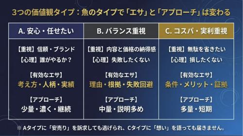 その中でも、特に重要なポイントとなるのが、その世帯におけるインテリア製品購入に際しての価値観の違いである。「安心して任せたい」のか、「納得して選びたい」のか、「できるだけ費用を抑えたい」のか。まずはこの三つの価値観タイプを見極めて「魚」を決める必要がある。この3つは、それぞれ訴求すべき内容や伝え方が大きく異なるためである。誰に対して販促を行うのか、曖昧なままでは伝える内容も曖昧になる。