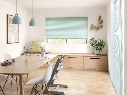 今回追加する「ハンドル操作」は、操作コードがなく、すっきりとした意匠性で、ブラインド下部に設けたハンドルを上下に動かして昇降を行う操作方法。ハンドルを軽く操作するだけで、好みの位置にブラインドの開閉が行えるため、片手でも扱いやすく、直感的に操作できる。また少ない動作でスムーズに開閉できる点も特徴である。小さな子どものいる家庭のダイニングやリビングなどの住宅空間に加え、クリニックや店舗などの非住宅空間にも導入しやすい仕様となっている。